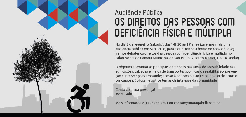 Serão debatidos os direitos das pessoas com deficiência física e múltipla no Salão Nobre da Câmara Municipal de São Paulo (Viaduto Jacareí, 100 - 8º andar).
