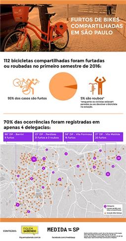Levantamento inédito do Fiquem Sabendo com base em boletins de ocorrência de 816 furtos ou roubos de bicicletas ocorridos no primeiro semestre deste ano em São Paulo mostra que, em 20% dos casos (112), a bicicleta levada pelo suspeito era do serviço de aluguel de bicicletas laranjas.