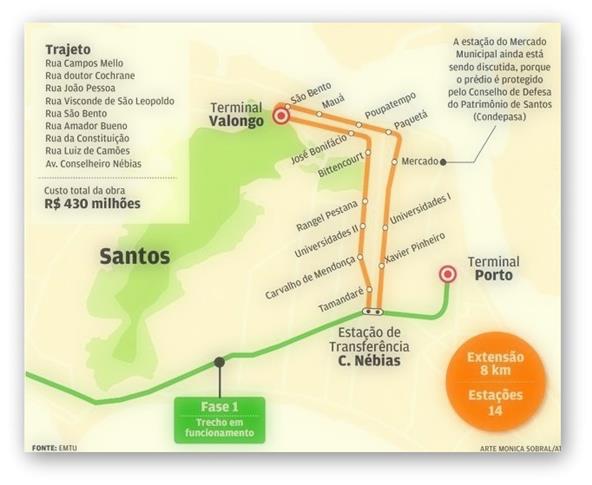 Ainda conforme ele, a estação do Mercado Municipal ainda está sendo discutida porque o prédio é protegido pelo Conselho de Defesa do Patrimônio de Santos (Condepasa): “Não sei como se vai resolver aquilo. Mas se não tiver jeito não é problema; a gente tira a estação”, esclareceu.