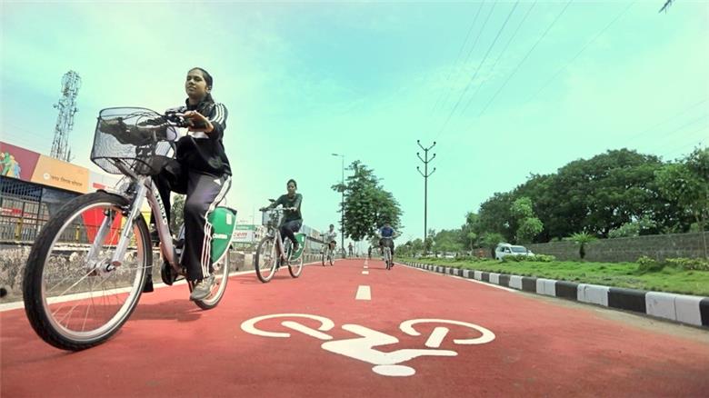 Jovem pedala na nova ciclovia de Bhopal com uma bicicleta compartilhada: ação privada com participação do governo Foto: Divulgação