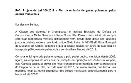 Na reunião, representantes do projeto Cidade dos Sonhos, Greenpeace, Instituto Brasileiro de Defesa do Consumidor (Idec), Minha Sampa e Rede Nossa São Paulo apresentarão, mais uma vez, estudos de viabilidade técnica e econômica que demonstram ser possível fazer a transição completa dos atuais ônibus a diesel para combustíveis 100% limpos em até 10 anos. O grupo espera que o vereador leve em conta esse parecer de especialistas no Projeto de Lei de sua autoria que deverá ser apresentado nos próximos dias.