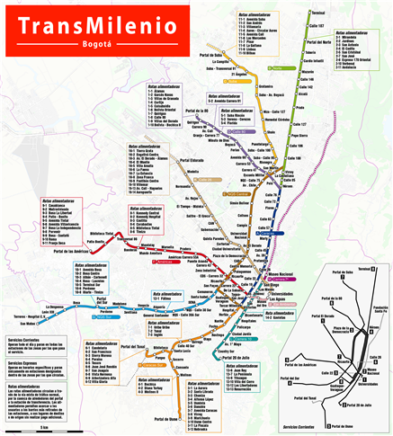 Um dos mais famosos BRTs do mundo, o TransMilenio significou um grande avanço no transporte urbano de Bogotá, a capital da Colômbia. Afinal, com 8 milhões de habitantes, até o ano 2000 a cidade contava somente com os ônibus comuns e micro-ônibus, ambos reféns dos grandes congestionamentos (trancones) que paralisam os bogotanos nos horários de pico.