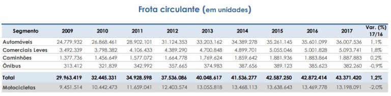 Contando todos os tipos de veículos - carros, comerciais leves, caminhões e ônibus -, a frota circulante no Brasil cresceu 1,2%, passando de 42,8 milhões (42.872.414) de unidades em 2016 para 43,3 milhões (43.371.420) em 2017.