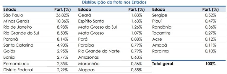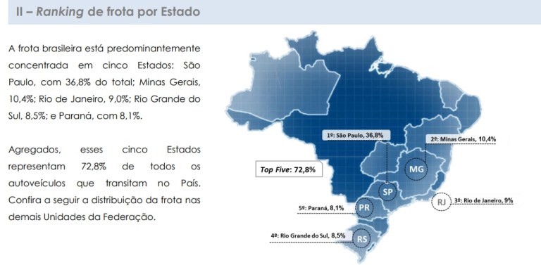 Apenas cinco estados concentram 72,8% de todos os veículos que transitam no país, segundo o Sindipeças: São Paulo, com 36,8% do total; Minas Gerais, 10,4%; Rio de Janeiro, 9,0%; Rio Grande do Sul, 8,5%; e Paraná, com 8,1%.