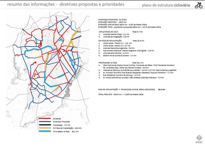 Com a realização da primeira etapa do plano, Curitiba chegará a um porcentual de 4,93% de vias urbanas destinadas à ciclomobilidade. O número é bem próximo aos 5% preconizados pela legislação que determina a construção de ciclofaixas e ciclovias de maneira integrada ao transporte coletivo. Hoje, a estrutura cicloviária implantada na cidade tem 208,5 km de extensão e equivale a 4,34% da malha viária.