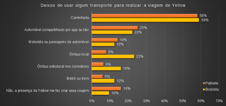 Entre 7 de março e 12 de abril de 2019 usuários de bicicletas e patinetes da marca Yellow foram convidados a participar de sua primeira pesquisa de caracterização com perguntas de múltipla escolha sobre o perfil dos usuários, das viagens, migração e integração modais, e percepção de segurança.