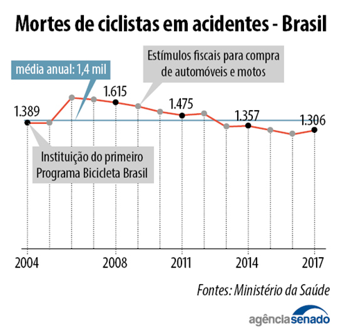 Conforme o Ministério da Saúde, 1.306 ciclistas morreram vítimas de acidentes no Brasil só em 2017. E o quadro não tem se alterado significativamente desde 2004, quando o hoje extinto Ministério das Cidades lançou o programa Bicicleta Brasil, reeditado em bases ampliadas na forma de uma lei aprovada em 2018 pelo Congresso e sancionada logo depois pelo presidente da República.