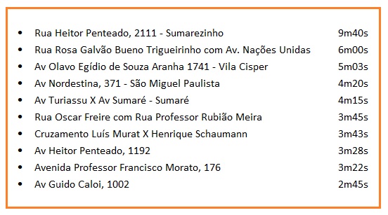 A média do tempo de espera calculado nos semáforos para pedestres de São Paulo foi de 1 minuto e 30 segundos. Por outro lado, a média para travessia ficou em apenas 6 segundos de verde. Segundo o estudo, os piores tempos de espera encontrados foram encontrados nos seguintes pontos da capital paulista: