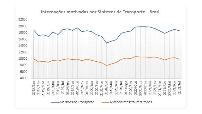 Dados do Ministério da Saúde mostraram que, de março de 2020 a julho de 2021, foram 308 mil internações em todo o Brasil. Destes, 54%, ou, 167 mil vítimas eram motociclistas. O levantamento da Abramet mostrou ainda que, desse total, 85% eram homens e jovens, com idades entre 20 e 29 anos.