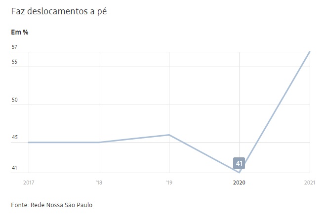 No ano passado, o mesmo levantamento tinha apontado que 41% da população fazia trajetos a pé, número que subiu para 57% agora em 2021. Entre 2017 e 2019, período pré-pandemia, esse percentual se manteve estável na casa de 45%.