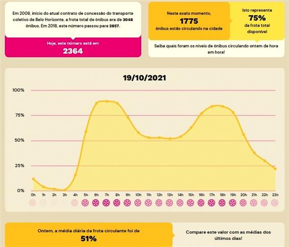 O aplicativo "Cadê meu Busão" foi criado para permitir que os próprios moradores de Belo Horizonte possam conferir o que está acontecendo a cada momento com o transporte na cidade. O economista André Veloso, do coletivo Tarifa Zero BH, explica que em 2008, quando foi assinado o contrato da concessão do transporte, a cidade contava com uma frota de mais de 3 mil ônibus, bem mais do que os 2.364 hoje disponíveis. E a consulta ao "Cadê meu Busão" realizada hoje (20/10/2021), às 18h30, mostra que 1.775 coletivos estavam realmente circulando, cerca de 75% da frota atual.