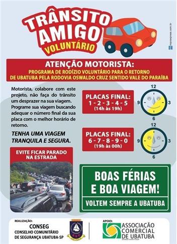 Após dois finais de semana marcados por congestionamentos na rodovia Oswaldo Cruz (SP-125), o Conselho Comunitário de Segurança de Ubatuba inicia no próximo dia 22 de dezembro o projeto "Rodízio Solidário, Amigos do Trânsito", cujo objetivo é implantar revezamento voluntário do uso da via aos domingos e finais de feriados no verão. Vinte mil panfletos serão distribuídos nas praias, restaurantes, pontos turísticos e cidades da região.