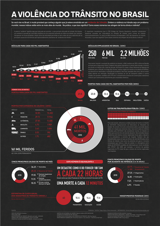 O índice de mortes no trânsito do Brasil é um dos mais altos do mundo: 22 a cada 100 mil habitantes. A estimativa, aqui, é de uma morte a cada 12 minutos. O infográfico a seguir, construído a partir da análise e cruzamento de dados de diferentes instituições e publicações (IBGE, Ministério da Saúde, Rede Nossa São Paulo, Mapa da Violência 2012 e Road Safety Annual Report 2011, entre outros), faz um pequeno retrato da violência do trânsito no Brasil.
