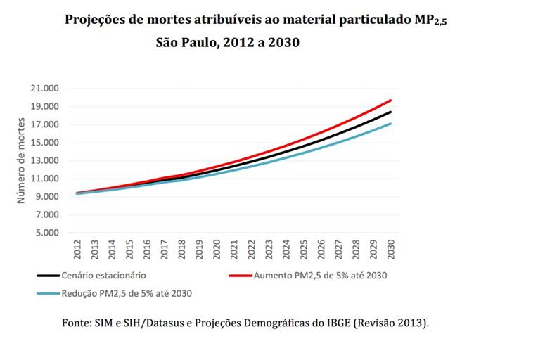 O estudo revelou, ainda, que mesmo se a emissão de poluentes reduzisse em 5% ao ano, em 2030 a má qualidade do ar chegará a matar 256 mil paulistanos. Sem projeção para o Rio, estima-se que entre 2006 e 2012, 14 pessoas morreram diariamente.