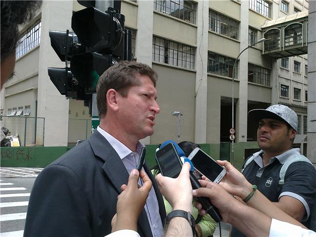 O secretário Jilmar Tatto (Transportes) durante a entrevista, no local das novas faixas de pedestres