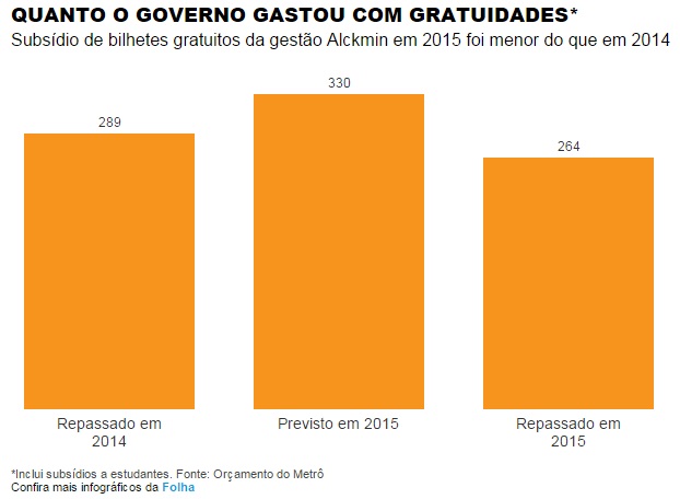 Esse valor também é 9% menor que os custos efetivos das gratuidades em 2014, quando a gestão tucana repassou ao Metrô R$ 289 milhões para essa finalidade.