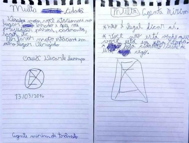 “Desculpe, moço, você estacionou no lugar errado e que vai prejudicar pessoas: cadeirantes, cegos etc. Por favor, moço, estacione em outro lugar. Obrigado”, diz o texto da Multa Cidadã escrita por Cauã. “Não é legal ficar aí. Você não está vendo que está em uma rampa? Seja cidadão, cuide de um cego”, adverte Iuri.