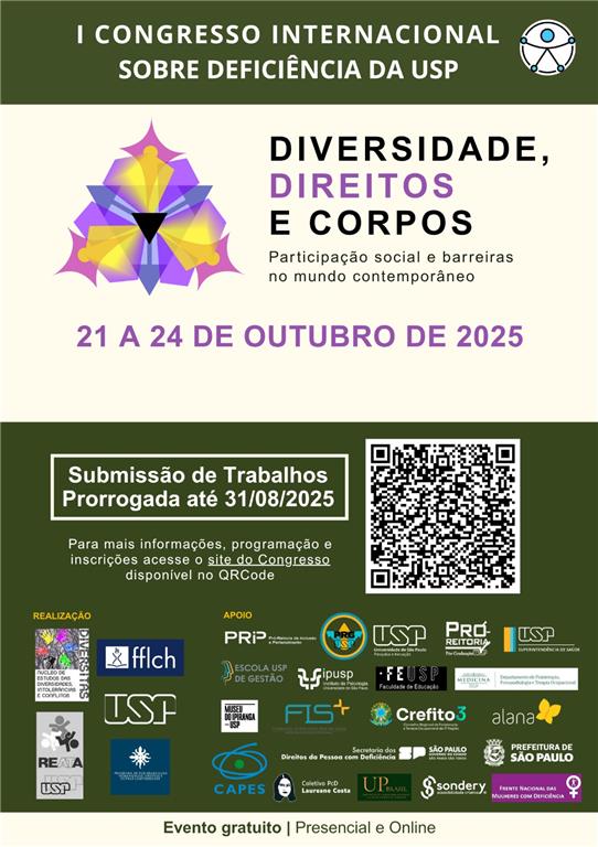 Considerando a relevância e atualidade de temas como a diversidade, os direitos, os corpos e deficiência, o Núcleo de Estudos das Diversidades, Intolerâncias e Conflitos da USP (Diversitas) promove o I Congresso Internacional sobre Deficiência na Universidade de São Paulo “Diversidade, Direitos e Corpos: Barreiras e Participação Social no Mundo Contemporâneo”, que será realizado de 21 a 24 de outubro de 2025 na Faculdade de Dilosofia, Letras e Ciências Humanas (FFLCH), Campus Butantã.