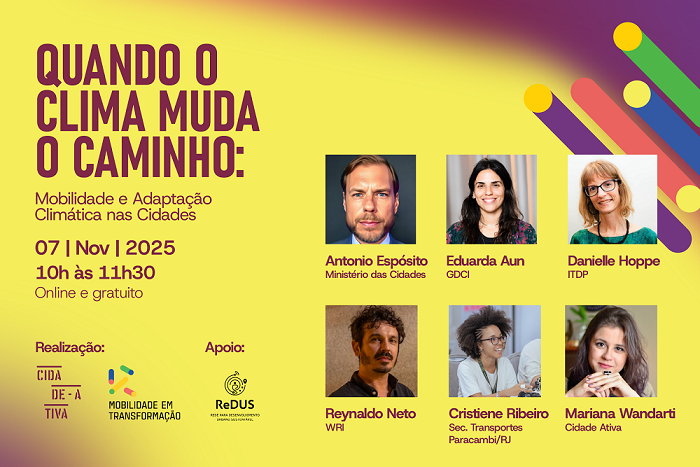 Será uma conversa para ajudar a entender como o clima impacta a mobilidade e o que podemos fazer para construir cidades mais resilientes, seguras e acolhedoras.