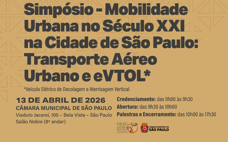 Resumo: Estão abertas inscrições para o simpósio "Mobilidade urbana no século XXI na cidade de São Paulo: Transporte aéreo urbano e eVTOL", promovido pelo Centro de Estudos Legislativos da Procuradoria da Câmara Municipal de São Paulo.