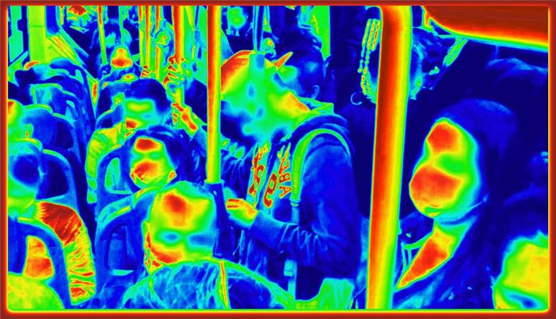 Imagem simulada de infravermelho em foto de ônibus lotado no Rio de Janeiro em maio de 2020