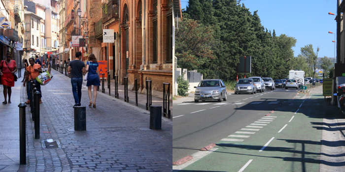 O sul da França é significativamente mais quente do que outras regiões do país, mas por pedalar ao longo de rios e canais, muitas vezes protegidos pelas sombras de árvores, o calor não chega a ser tão fatigante. Chegando em Toulousse, uma bela cidade com quase 500 mil habitantes, pude confirmar o que já havia notado em outros centros europeus: os fortes investimentos em infraestrutura cicloviária, em calçadas e no transporte coletivo, em detrimento ao modelo rodoviarista individual.