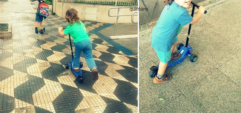 Mas aqui na cidade as calçadas são “perigosas”: garagens, buracos…sim, para conseguir levar aos filhos de patinete até a escola (eu já fiz testes, veja a foto a seguir) precisa de algumas regras. Se for uma rua com muitas garagens, não dá para correr muito sem que o adulto possa ir checando que está tudo ok. Também ensinar aos filhos como saber o que é uma garagem, qual é o código das luzes (quando há). Saber que quando falamos “espera por mim!” é para obedecer….mas será que espera?