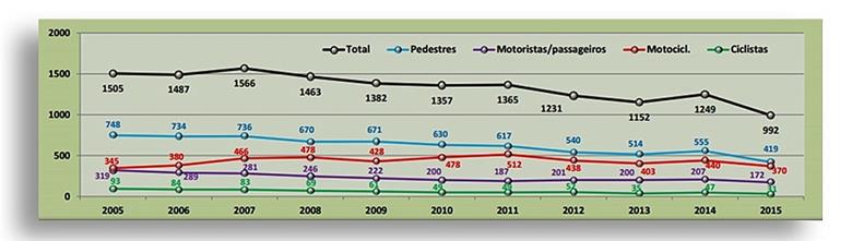 Evolução anual do número de mortos no trânsito de São Paulo (Relatório Anual de Acidentes de Trânsito 2015, CET SP)