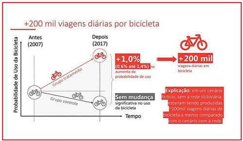 Para projetar os ganhos obtidos, a análise abordou teoricamente as possíveis mudanças de hábitos de transporte a partir de documentos como a Pesquisa Origem-Destino (2007 e 2017), o Censo IBGE e dados da CET. O resultado apontava que cerca de 200 mil viagens diárias adicionais estariam sendo estimuladas na cidade com a oferta das novas ciclovias construídas a partir de 2015.