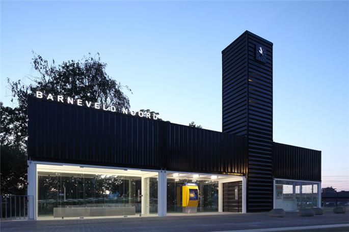 Projetada pelo escritório NL Architect, a estação de trem Barneveld Noord, na cidade de Utrecht, na Holanda, foi estruturada a partir de contêineres. O projeto conta com três módulos suspensos, e o destaque do layout fica por conta do contêiner posicionado na vertical, que sugere as tradicionais torres de relógio.