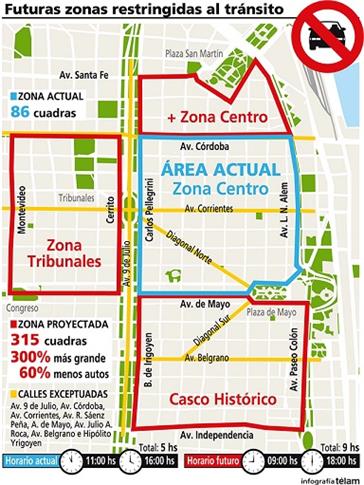 Atualmente, a restrição a carros está em vigor no polígono formado pelas avenidas Rivadavia, De Mayo, Pellegrini, Córdoba e Alem, e no horário das 11h às 16h. Com a ampliação, esta área passa a compreender também as avenidas Independencia, 9 de Julio, Santa Fe e Leandro N. Alem-Paseo Colón, completada pelo entorno de Tribunales, delimitado pelas ruas Montevideo, entre Córdoba e Avenida Rivadavia.