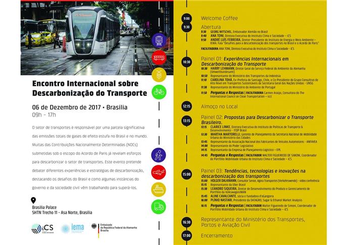Para este encontro em Brasília, estão confirmados os palestrantes internacionais Harry Lehmann, diretor geral do Serviço Federal do Ambiente da Alemanha (Umweltbundesamt); Carolina Tohá, ex-prefeita de Santiago (Chile) e co-presidente do Grupo Consultivo de Alto Nível em Transportes Sustentáveis da Secretaria Geral das Nações Unidas (UNSG); e José Mendes, secretário de Estado Adjunto e do Ambiente de Portugal, que acaba de lançar, na COP23, a Aliança para a Descarbonização do Transporte, um esforço conjunto de várias nações como França, Holanda, Costa Rica e Portugal, além de empresas como Michelin e a Itaipu Binacional.