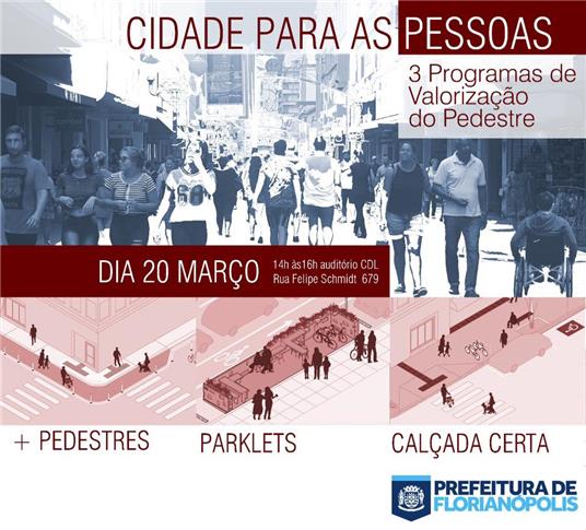 Com o objetivo de qualificar as calçadas e cada vez mais ampliar o espaço público de convivência para os pedestres, a Prefeitura de Florianópolis lança o projeto ‘Cidade para as Pessoas’. A ideia é estimular os deslocamentos a pé, contribuindo para a melhoria da mobilidade urbana e ampliação da acessibilidade na cidade.