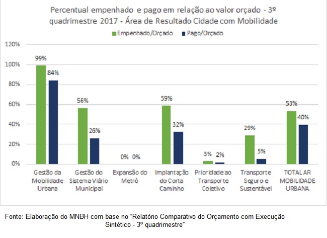 O Movimento Nossa BH divulgou agora seu relatório sobre o orçamento público municipal de 2017, referente aos investimentos feitos na área de mobilidade urbana. Mais uma vez, observou-se por esse levantamento que os gastos com a mobilidade ativa, coletiva e acessível continuam fora da prioridade nas políticas e investimentos da capital mineira, conclui o documento. O estudo considerou o último ano do ciclo orçamentário do Plano Plurianual de Ação Governamental (PPAG 2014-2017), elaborado pela então gestão municipal para orientar o planejamento estratégico da administração.