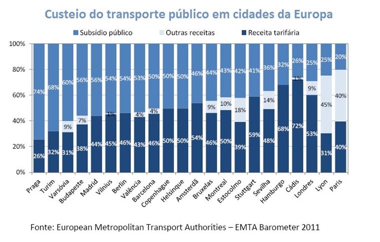 Os especialistas relatam que até mesmo na cidade e na Região Metropolitana de São Paulo, onde o sistema de transporte coletivo urbano conta com subvenções pagas pelo conjunto da sociedade – por meio do orçamento geral do município e do estado – que cobrem cerca de 20% dos custos das operações, os subsídios estão bem abaixo dos níveis médios de subvenções da Europa. A Nota Técnica aponta um sistema de financiamento do transporte público em muitos países que cobre entre 40% e 50% dos custos.