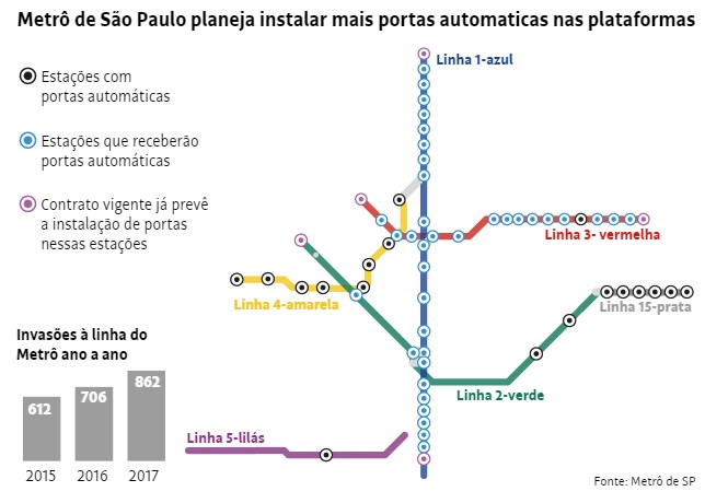 Para reduzir as interferências provocadas por invasões aos trilhos e aumentar a segurança, o Metrô de São Paulo planeja retomar um antigo projeto de instalação de portas automáticas nas plataformas das estações. O plano da empresa, sob a gestão de Márcio França (PSB), ocorre após a alta de 41% desses episódios de 2015 a 2017. São casos de vandalismo, imprudência, tentativas de suicídio, queda de usuários e também de objetos.