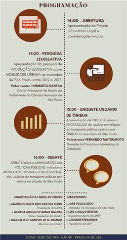 Durante o evento, haverá a apresentação da pesquisa de produção legislativa sobre mobilidade urbana, e em seguida a divulgação do resultado de uma enquete realizada pelo Cemu com as opiniões dos usuários de ônibus da cidade. No final, um debate contará com a participação de especialistas em transportes e parlamentares.