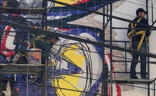 Artistas durante os rabalhos de produção do mural em Curitiba. Foto: Divulgação