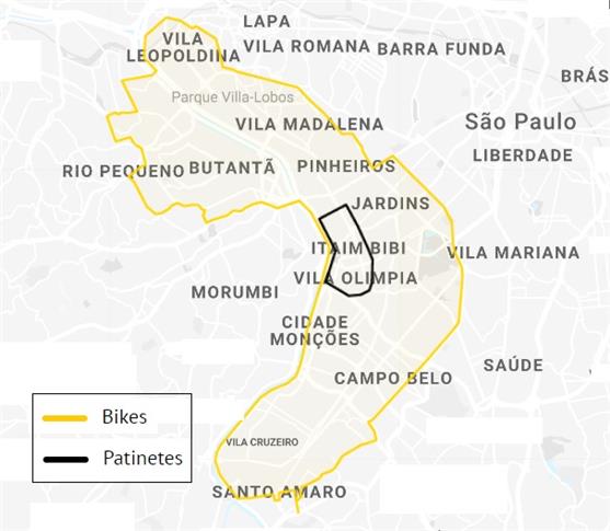 Assim como as bicicletas, os patinetes terão uma área restrita de atuação. As bikes, aliás, começaram sem restrição de área para a finalização do uso, política que foi ajustada posteriormente. A área de uso para os patinetes, porém, é mais limitada: apenas o bairro do Itaim Bibi.