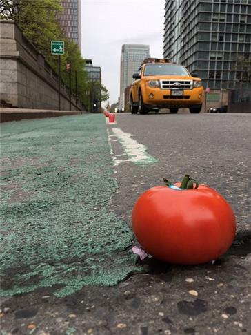 Em poucos minutos, os copos e tomates costumam ser massacrados por veículos motorizados, criando uma cena poderosa de pontos vermelhos no asfalto, como a lembrar o sangue derramado por tanta gente morta de bike na violência do trânsito.