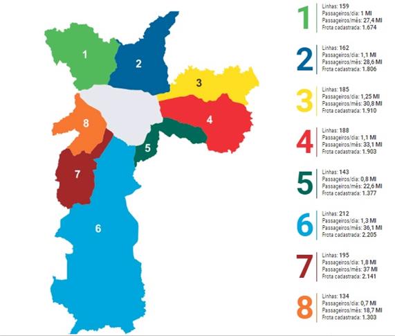 Cores e áreas de circulação dos ônibus em São Paulo Imagem: SPTrans