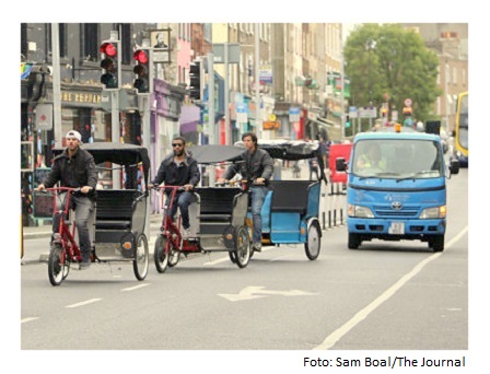 Entre os veículos que ainda dependem de regulação do setor, um é inusitado. O rickshaw, (riquixá, em português) uma espécie de tuc-tuc com bicicleta. O Ministério dos Transportes estima que circulem cerca de mil na capital da Irlanda. Eles são clandestinos e podem ser vistos à noite, nas portas dos pubs. Atendem jovens e turistas que bebem além da conta ou ficam cansados para ir embora a pé. O táxi aqui é muito caro. Ano passado, 154 condutores de rickshaw foram presos numa ação contra o uso de drogas.