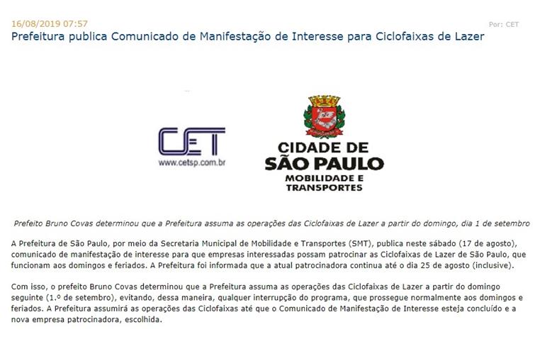 A Bradesco Seguros decidiu encerrar a parceria, e no sábado, 17 de agosto, a Secretaria Municipal de Mobilidade e Transportes (SMT) publicou um comunicado de manifestação de interesse para que empresas patrocinem as ciclofaixas de lazer de São Paulo, que funcionam aos domingos e feriados, das 7h às 16h.