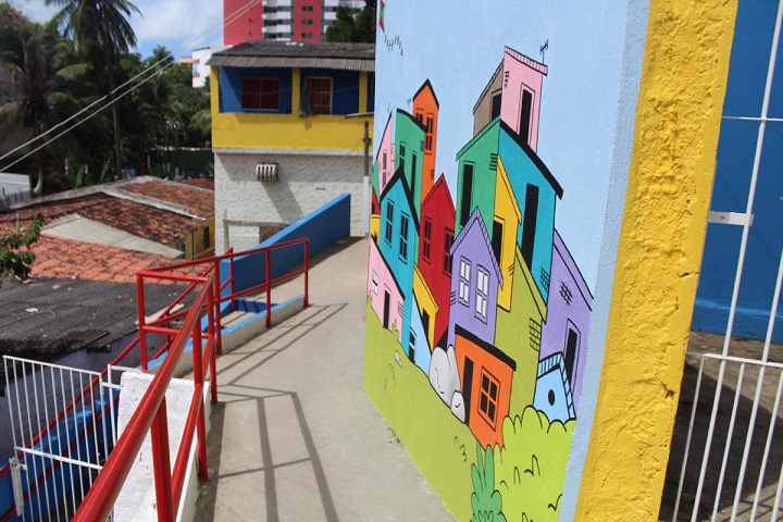 Escadaria requalificada e destacada por pintura em cores vivas. Foto: Lívia Holanda