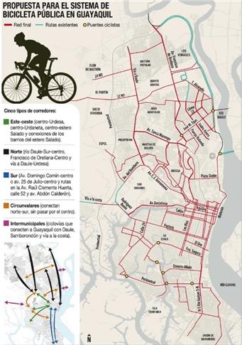 Na proposta, cinco corredores exclusivos para bicicleta foram recomendados, nas direções: leste-oeste (centro-bairros); norte; sul; cicloanel norte-sul (sem passar pelo centro) e intermunicipais (ciclovias conectando Guayaquil a Daule e Samborondón, e uma via pela costa).