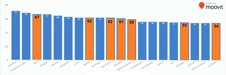 O Rio de Janeiro é a cidade brasileira onde o cidadão mais perde tempo no transporte público. Pelo menos 11% dos deslocamentos feitos na capital carioca duram mais de duas horas; já o tempo médio de deslocamento é de uma hora e 2 minutos. No ranking mundial, o Rio figura em terceira posição, ficando atrás de Istambul, na Turquia (72 minutos), e da Cidade do México (69 minutos).