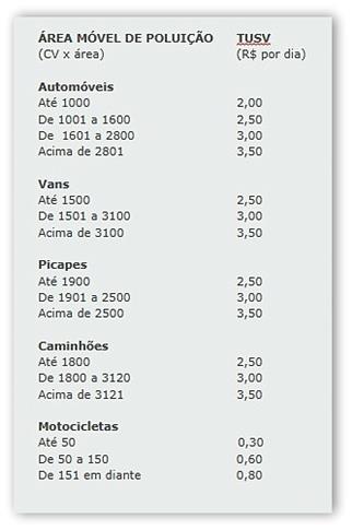 O valor da TUSV seria calculado a partir da criação da Área Móvel de Poluição (AMP), que é o resultado do produto da potência do motor (em CV) pela área ocupada pelo veículo em metros quadrados, medida pelo produto de seu comprimento pela sua largura.