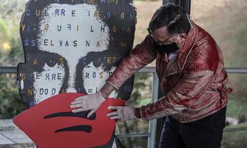 Alex Flemming aplica máscara sobre seu próprio retrato na obra Foto: Xinhua/Rahel Patrasso