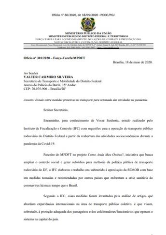 A força-tarefa do Ministério Público do Distrito Federal e Territórios (MPDFT) que acompanha medidas de prevenção e combate à pandemia da Covid-19 encaminhou à Secretaria de Transporte e Mobilidade (Semob/DF) sugestões para a operação do transporte público a partir da reabertura das atividades socioeconômicas. O estudo foi elaborado pelo Instituto de Fiscalização e Controle (IFC), parceiro do projeto "Como anda meu ônibus?".