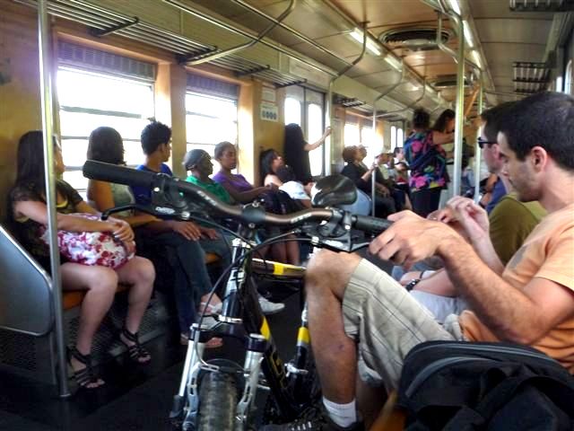 Ciclista transporta sua bike em trem da CPTM, na RMSP. Foto: Mobilize